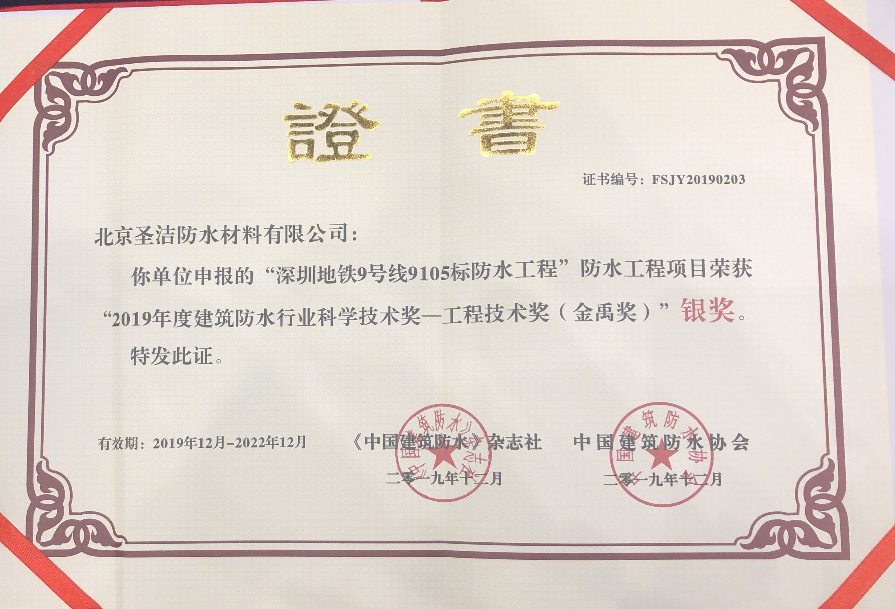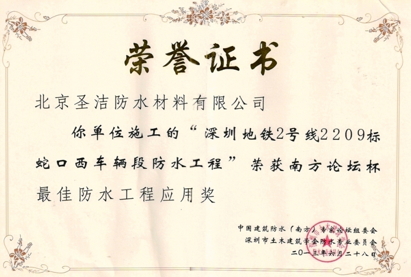 “深圳地鐵9號(hào)線9105標(biāo)段防水工程”獲