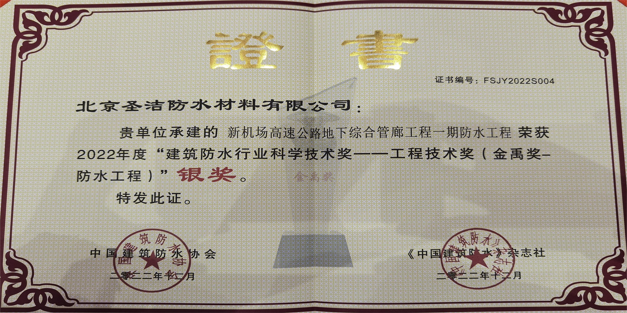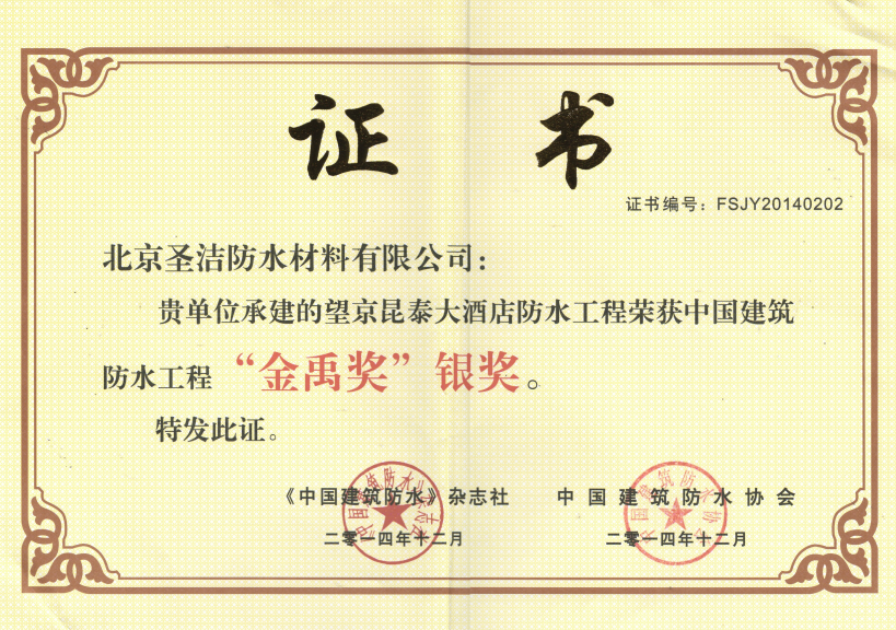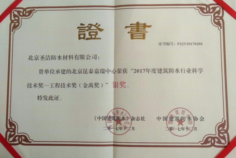 中國(guó)建筑防水工程“金禹獎(jiǎng)”銀獎(jiǎng)