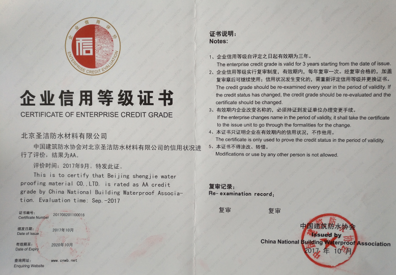 AAAA建筑防水行業(yè)質(zhì)量誠(chéng)信評(píng)價(jià)證書