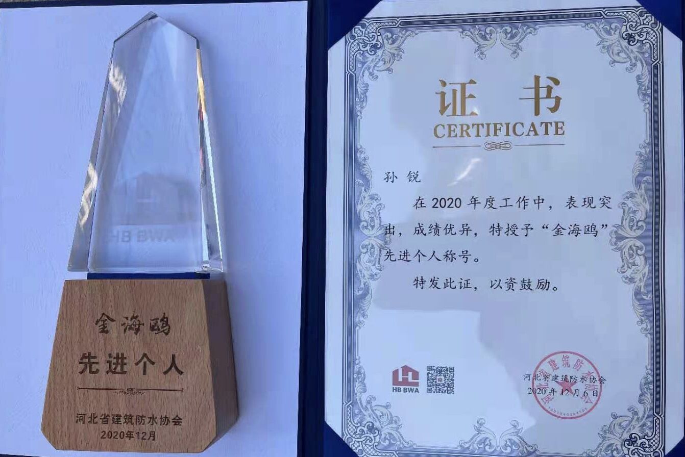 河北省建筑防水協(xié)會(huì)‘金海鷗’先進(jìn)個(gè)人稱號(hào)
