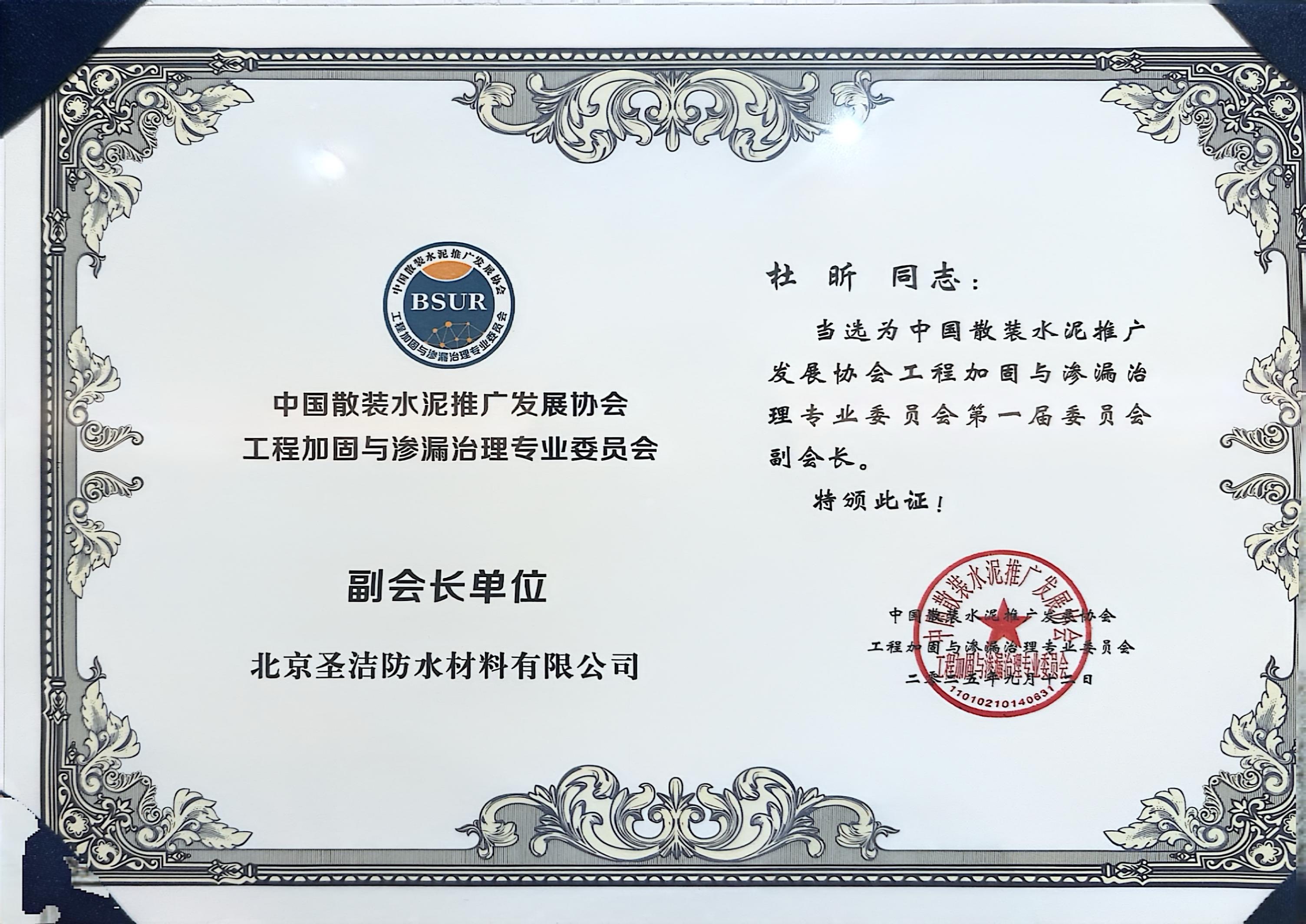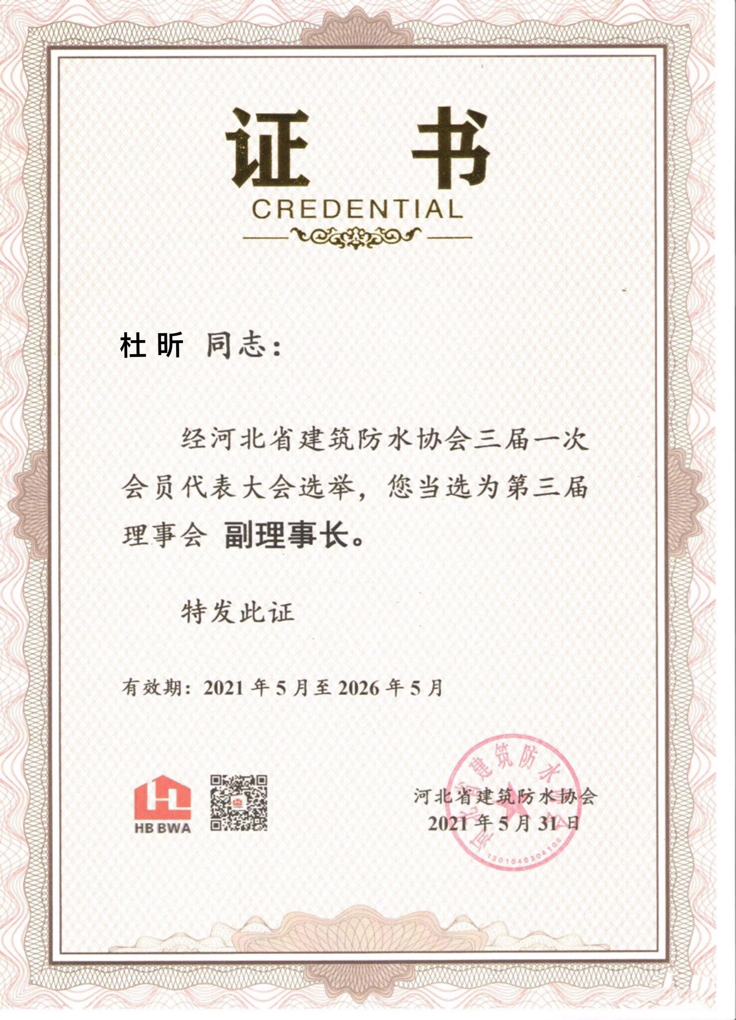 杜昕河北防水協(xié)會(huì)副理事長(zhǎng)證書