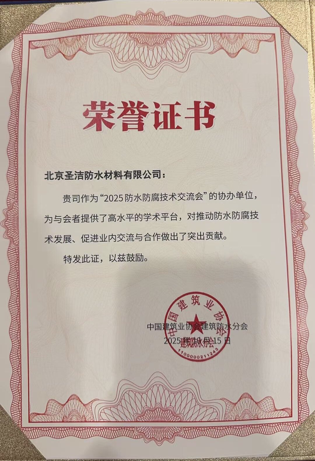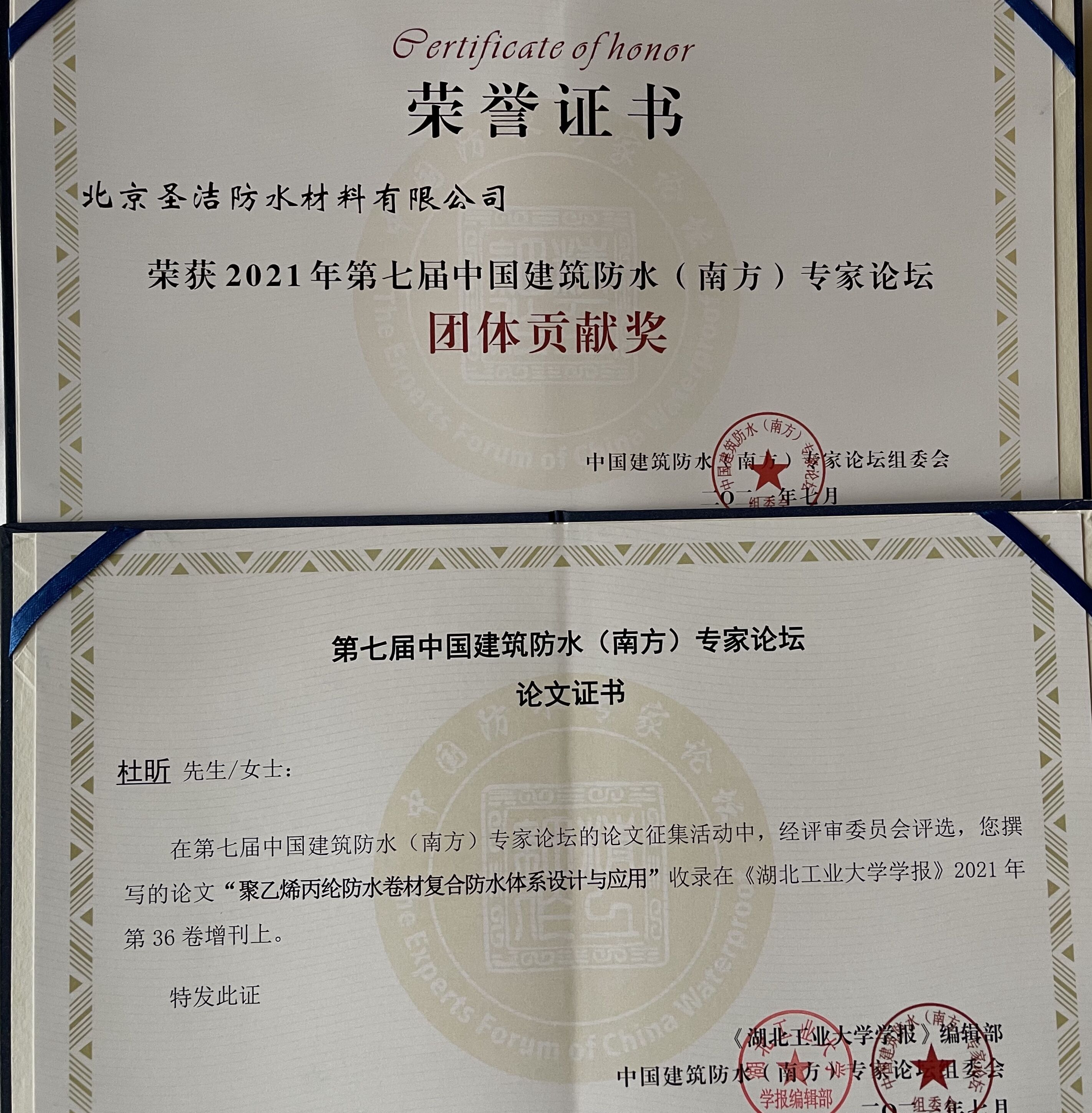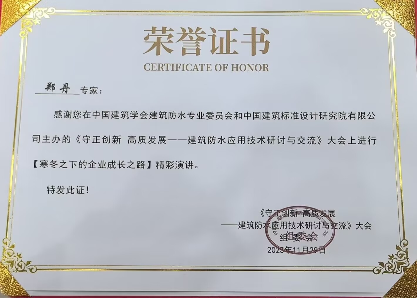 中國(guó)建筑學(xué)會(huì)建筑防水學(xué)術(shù)委員會(huì)榮譽(yù)證書