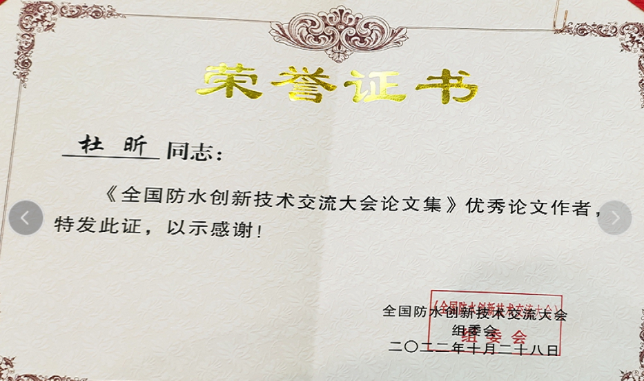 杜昕全國(guó)防水創(chuàng)新技術(shù)交流大會(huì)論文集優(yōu)秀論