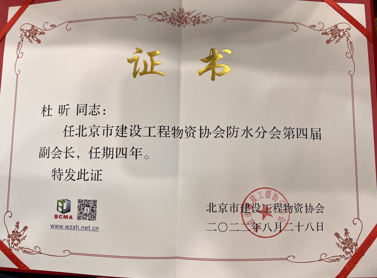 杜昕任北京建設(shè)工程物資協(xié)會(huì)防水分會(huì)副會(huì)長(zhǎng)