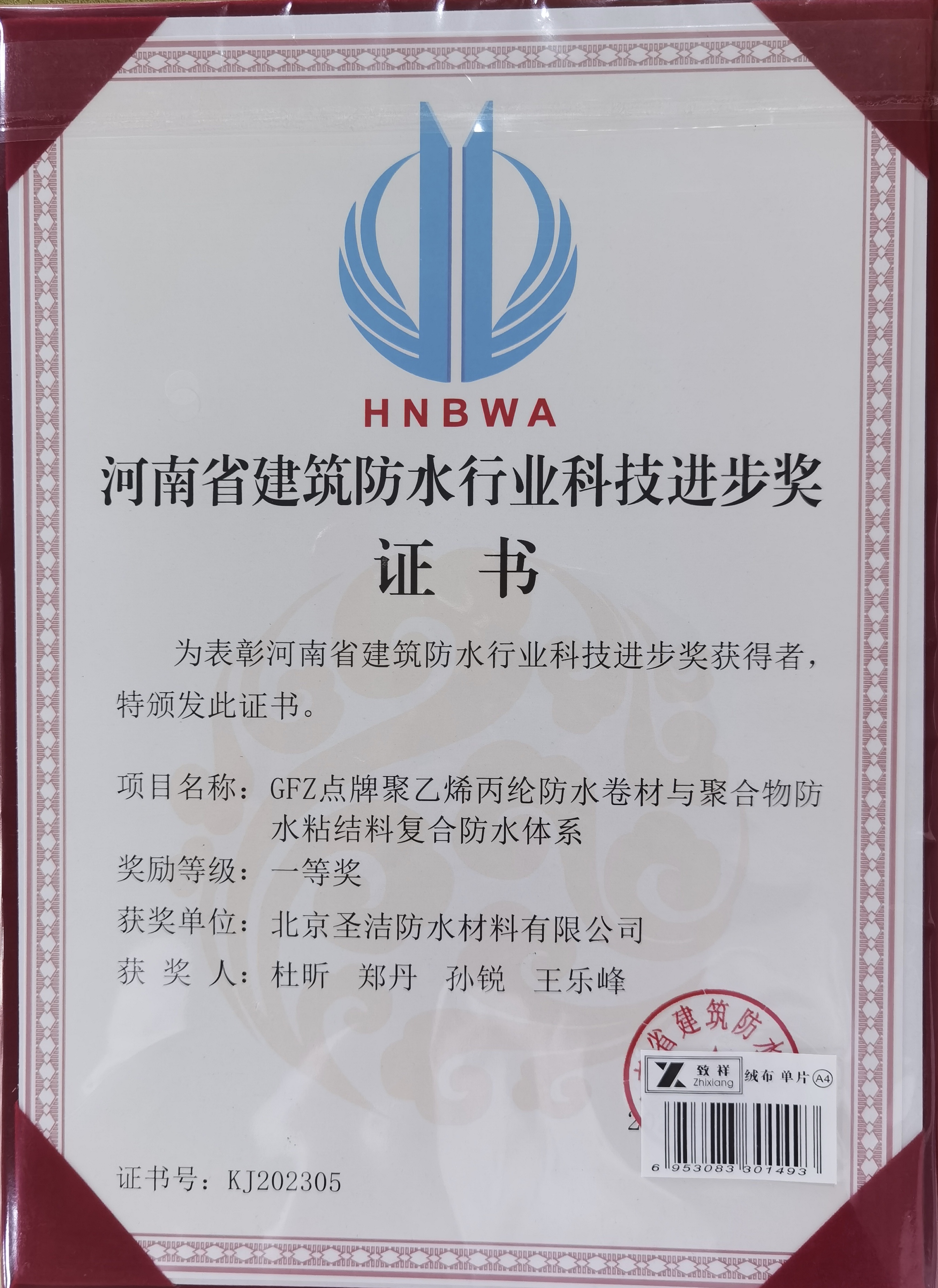 河南省建筑防水行業(yè)科技進(jìn)步獎(jiǎng)一等獎(jiǎng)