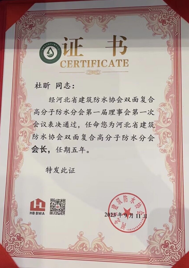 圣潔董事長(zhǎng)杜昕河北省建筑防水協(xié)會(huì)雙面復(fù)合